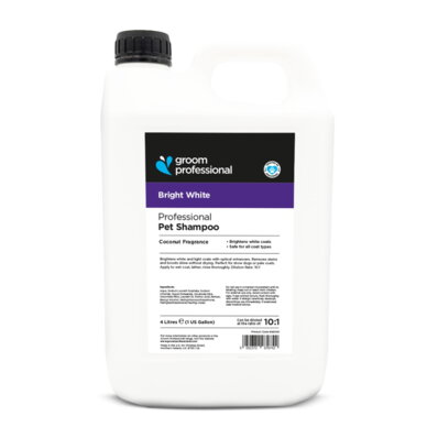 Groom Professional Bright White Shampoo to szampon przeznaczony do jasnej sierści, który zawiera wzmacniacz koloru, aby pomóc rozjaśnić szatę i jednocześnie usunąc przebarwienia. Zawiera również olej kokosowy, dzięki czemu skóra i szata jest odżywiona i pięknie wygląda. Nie zawiera żadnych szkodliwych substancji chemicznych ani wybielaczy. Idealny dla Bichonów, Pudli i Westów.