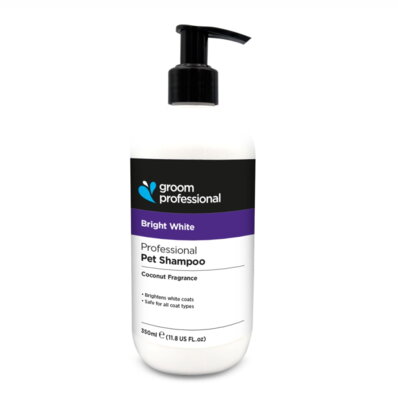 Groom Professional Bright White Shampoo to szampon przeznaczony do jasnej sierści, który zawiera wzmacniacz koloru, aby pomóc rozjaśnić szatę i jednocześnie usunąc przebarwienia. Zawiera również olej kokosowy, dzięki czemu skóra i szata jest odżywiona i pięknie wygląda. Nie zawiera żadnych szkodliwych substancji chemicznych ani wybielaczy. Idealny dla Bichonów, Pudli i Westów.